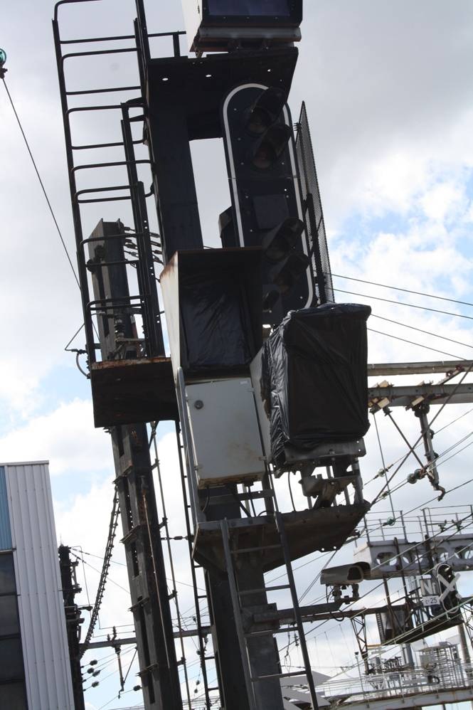 Encore plus significatif qu’une photo d’un signal éteint; coté nord, l’enfilade de signaux équipés d’une croix de St-André fait peine à voir. (un « X » en bois blanc)