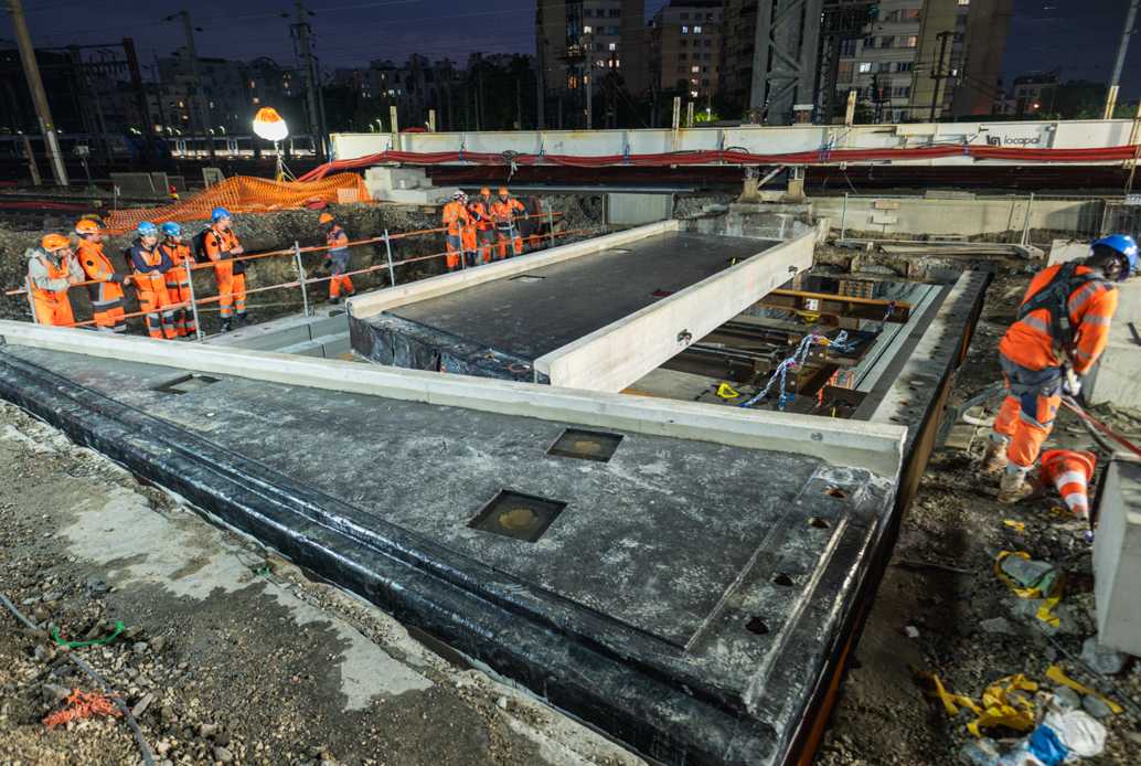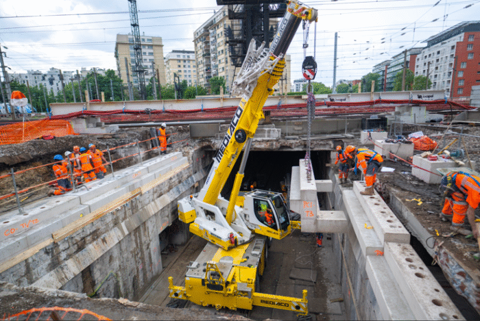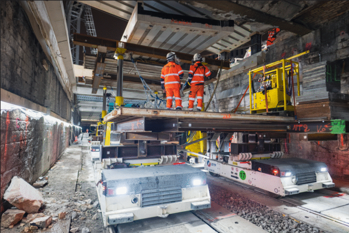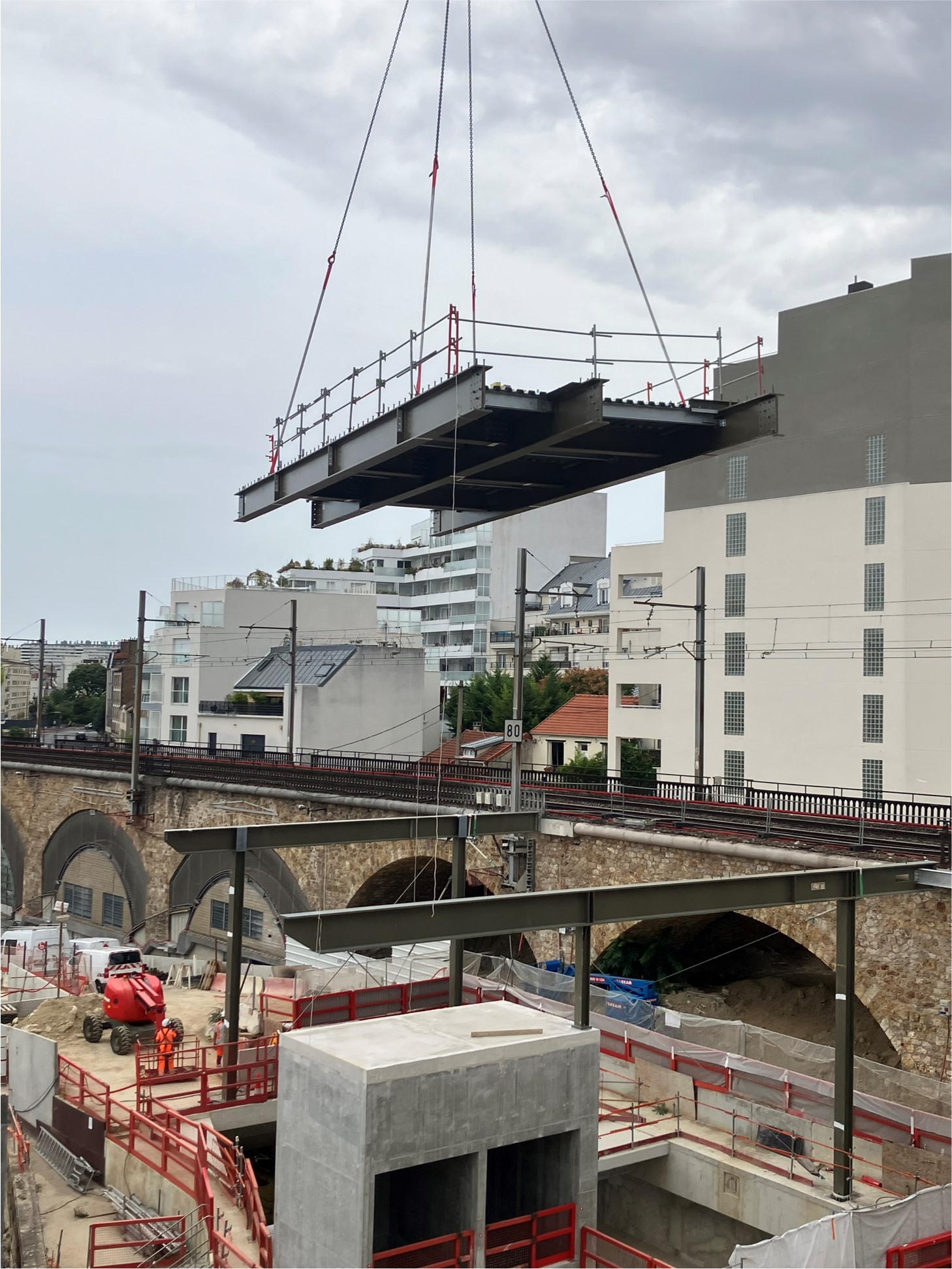 ➡️ Grutage de structures métalliques des deux côtés de la plateforme ferroviaire pour construire la nouvelle gare RER C et prolonger les quais de 80 mètres côté Paris.