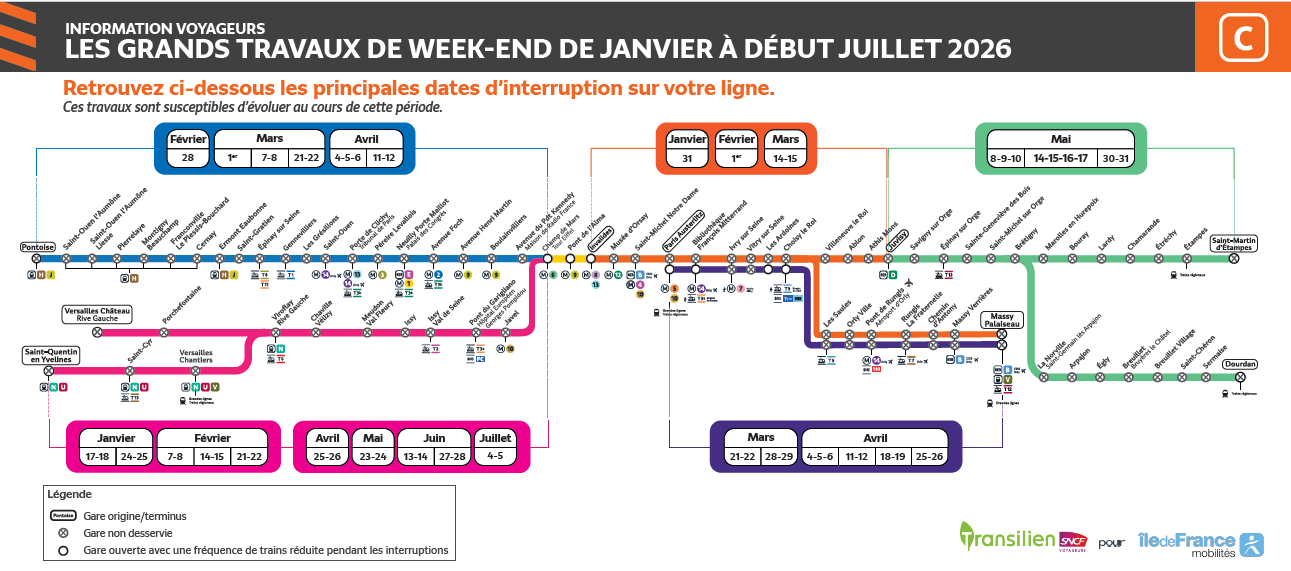 • une légende plus explicite, précisant que toutes les gares d’une branche ne sont pas nécessairement impactées lors d’une coupure (ex : branche Massy lorsque la branche Juvisy circule).